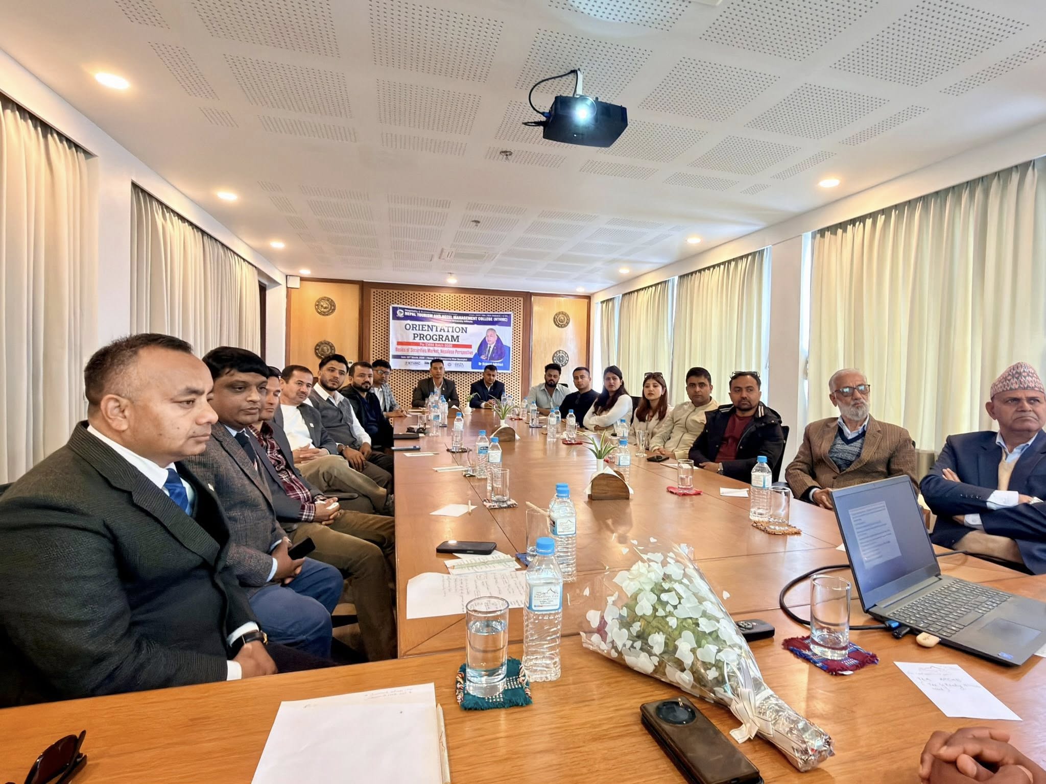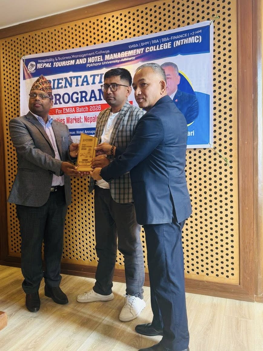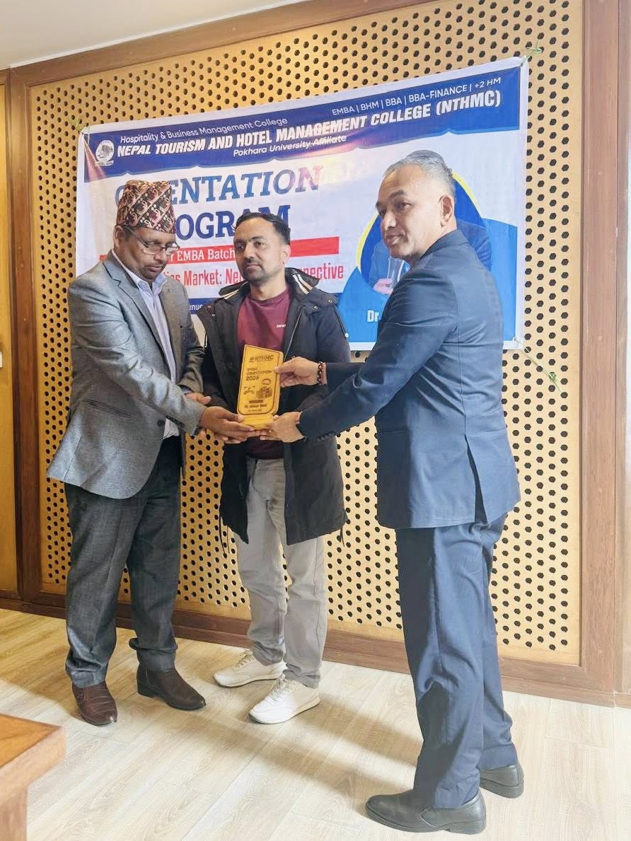 The Executive Masters in Business Administration (EMBA) Orientation Program was successfully held at Annapurna View Sarangkot. The event was honored by Mr. Raju Pandey, Controller of Examinations at Pokhara University, as the Chief Guest, and Dr. Nabaraj Adhikari, Executive Director of the Securities Board of Nepal, as the Keynote Speaker.